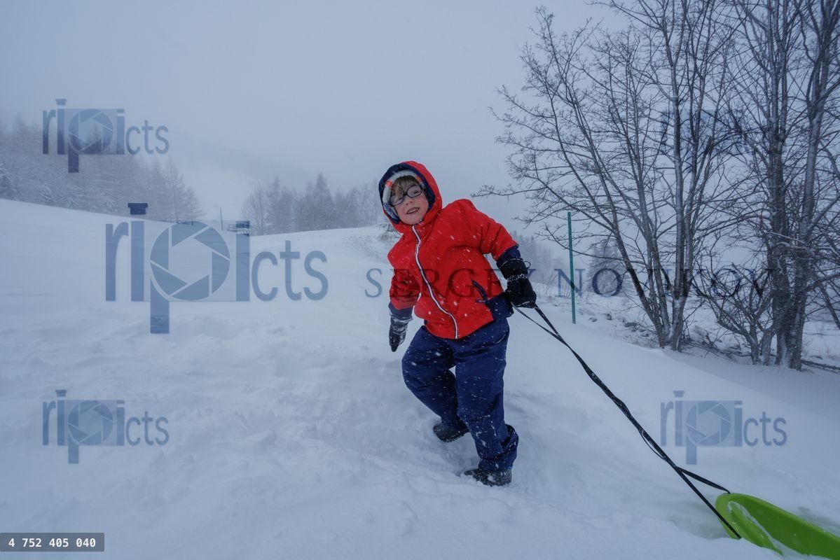 A boy in a red snowsuit pulls a green sled uphill across a glistening snow covered field at blizzardLoading purchase options...
