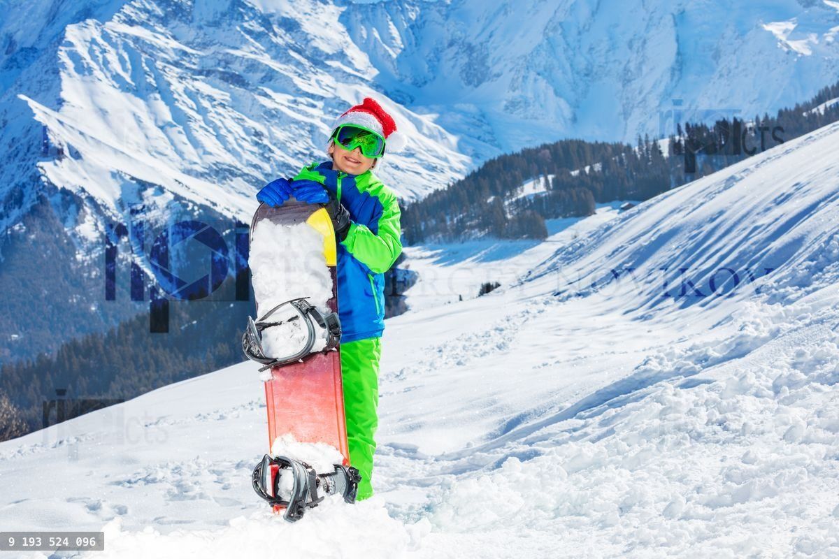Boy in Santa Claus hat and ski googles stand with snowboard
