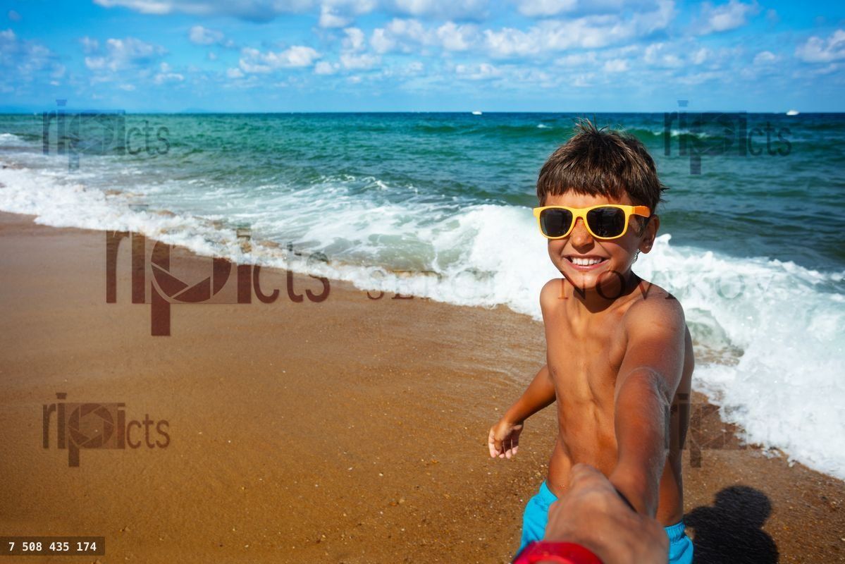 Cute little boy in sunglasses pull parent's hand to the sea with big smile and waves on backgroundLoading purchase options...