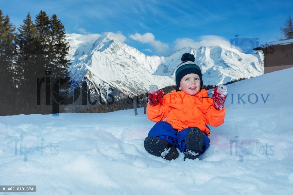 Happy little boy in winter outfit play outside in snow with mountains on backgroundLoading purchase options...