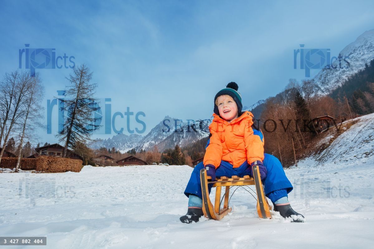 Boy in winter outfit sit on the sledge about to slide downhill smiling and having fun on vacationsLoading purchase options...