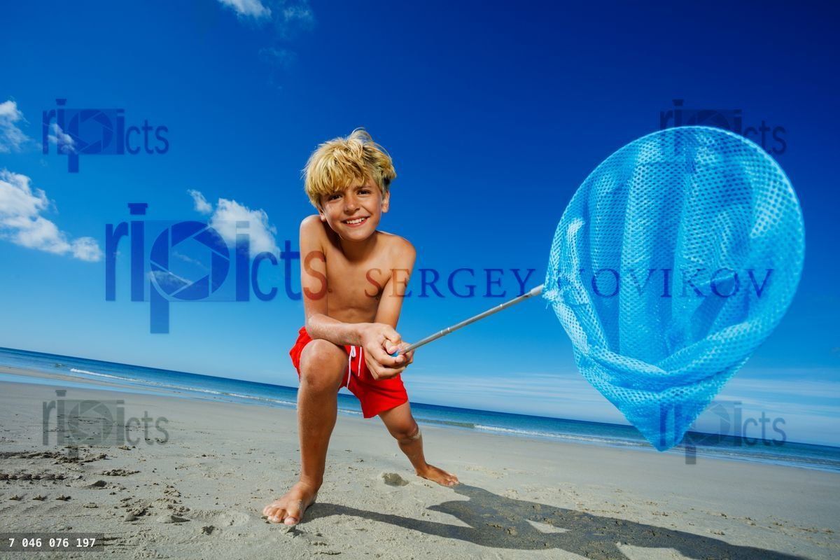 Boy lean holding butterfly net catching critters on beach