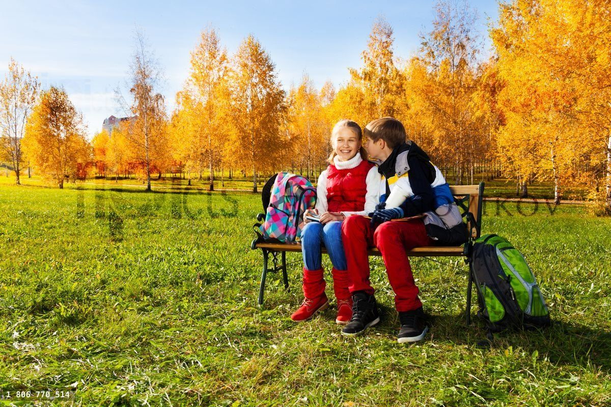 Couple children, boy whispering to girl sitting on the bench in autumn park with backpacks laying near byLoading purchase options...