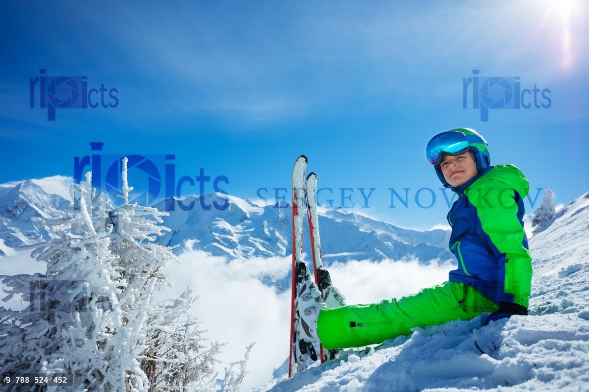 Boy with alpine ski sit in snow turn to camera smiling, wear helmet and sport glasses on top of the mountain over peaks covered by clouds on backgroundLoading purchase options...