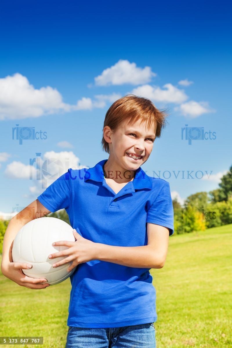 waist up portrait of volleyball player boy in blue stand with ball in the field on nice sunny summer day, laughing and happyLoading purchase options...