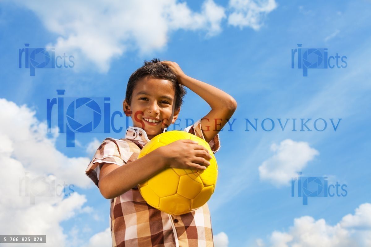 Happy smiling boy with soccer ball holding head with hand on sky backgroundLoading purchase options...
