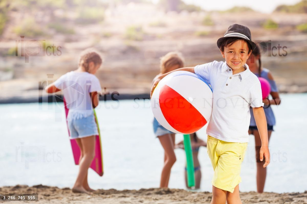 Happy little boy on the sea with beach ball and his friendsLoading purchase options...