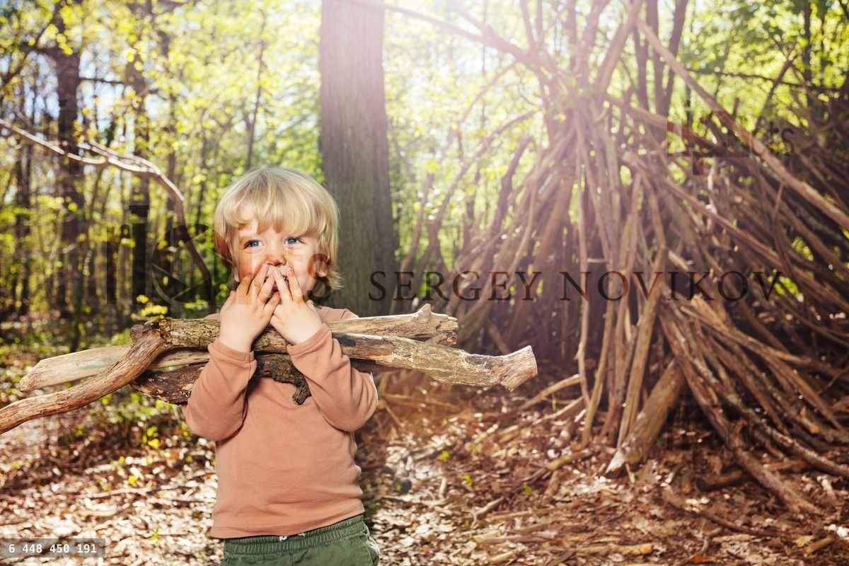 Happy little child, boy with pile of brushwood in the forest build hut of branchesLoading purchase options...