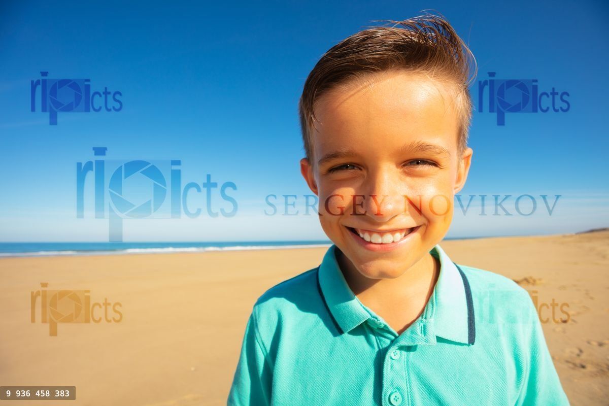 Boy with cute smile on the sea sand beach portrait