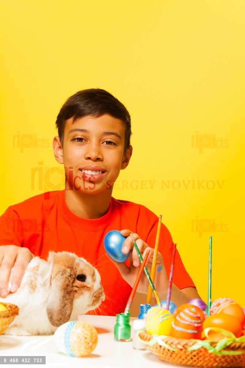 Boy with colourful Easter eggs with cute rabbit on the white table and yellow backgroundLoading purchase options...