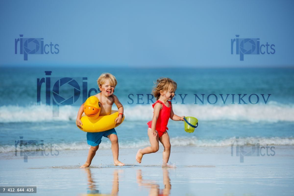 Cute little boy with girl run holding toy inflatable buoys duck and plastic bucket having fun running on the sand beachLoading purchase options...