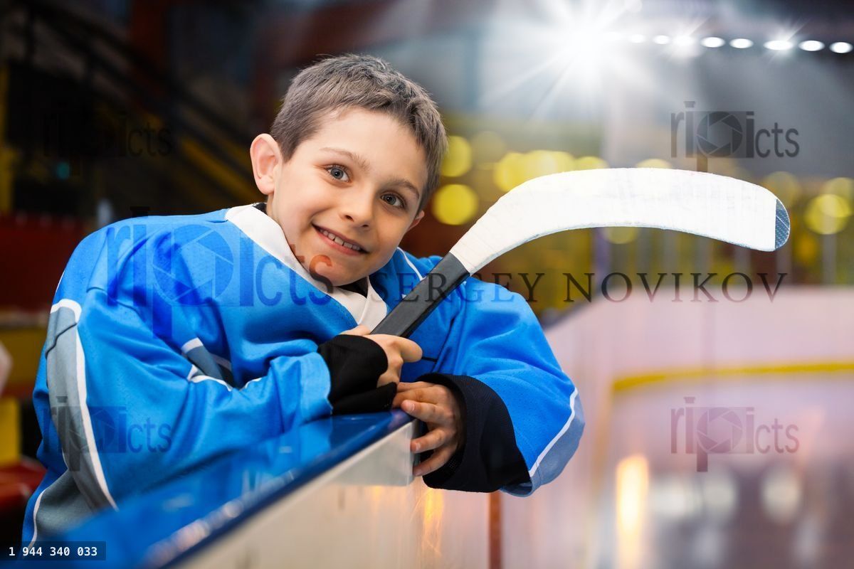 Portrait of happy boy, ice hockey player, leans on the boards of the rinkLoading purchase options...