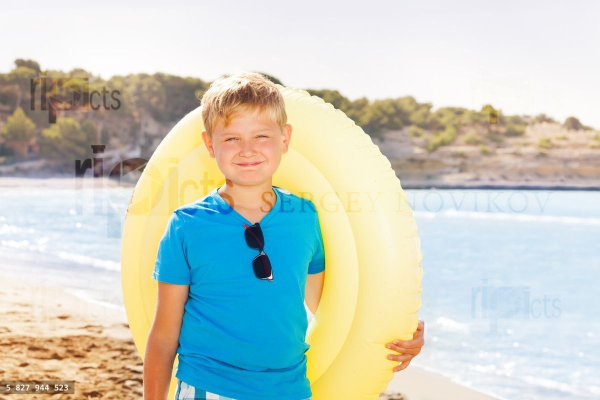 Boy with inflatable ring for swimming in the sea stand on beach and smilingLoading purchase options...