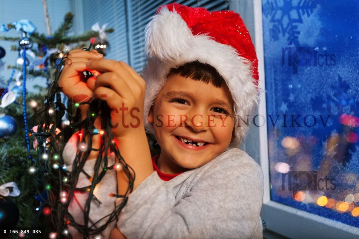 Portrait of little boy laughing smiling and holding New Year illumination lights about to put them on Christmas treeLoading purchase options...