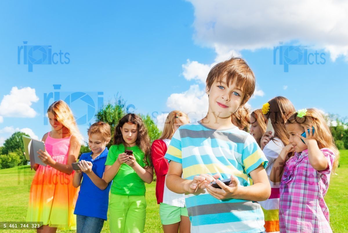 One smiling school age boy standing with digital devices, text, sms, play, post to social network outside, with group of happy friends kids boys and girlsLoading purchase options...