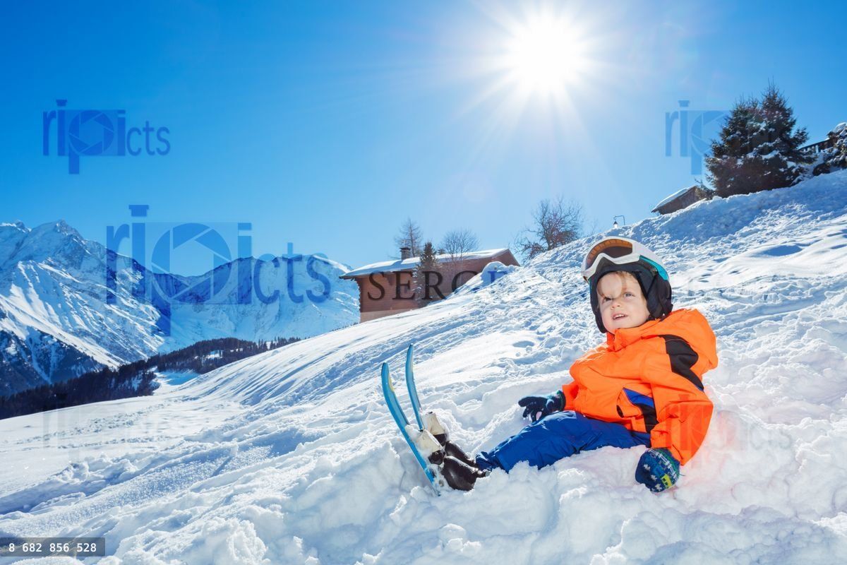 Happy little boy with ski ready to go skiing school sit in snow over high mountainLoading purchase options...