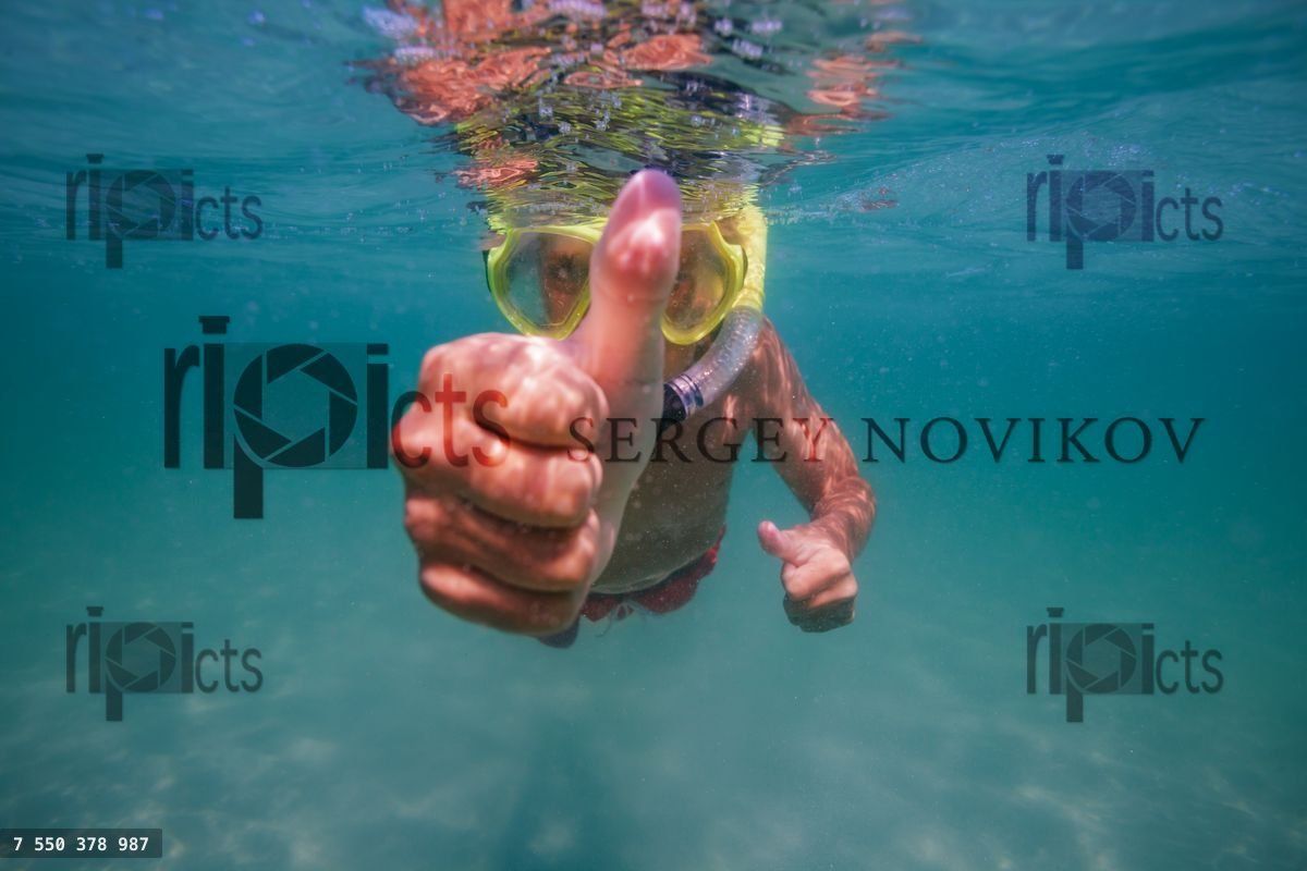 Boy with snorkel, mask show thumb up swimming underwater in the oceanLoading purchase options...