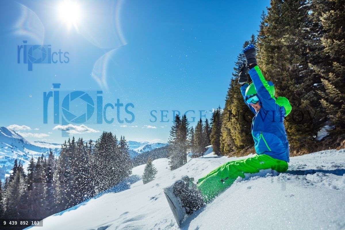 Boy happily lift hands with snowboard sit on the ski track high in the mountains, forest and sun on backgroundLoading purchase options...