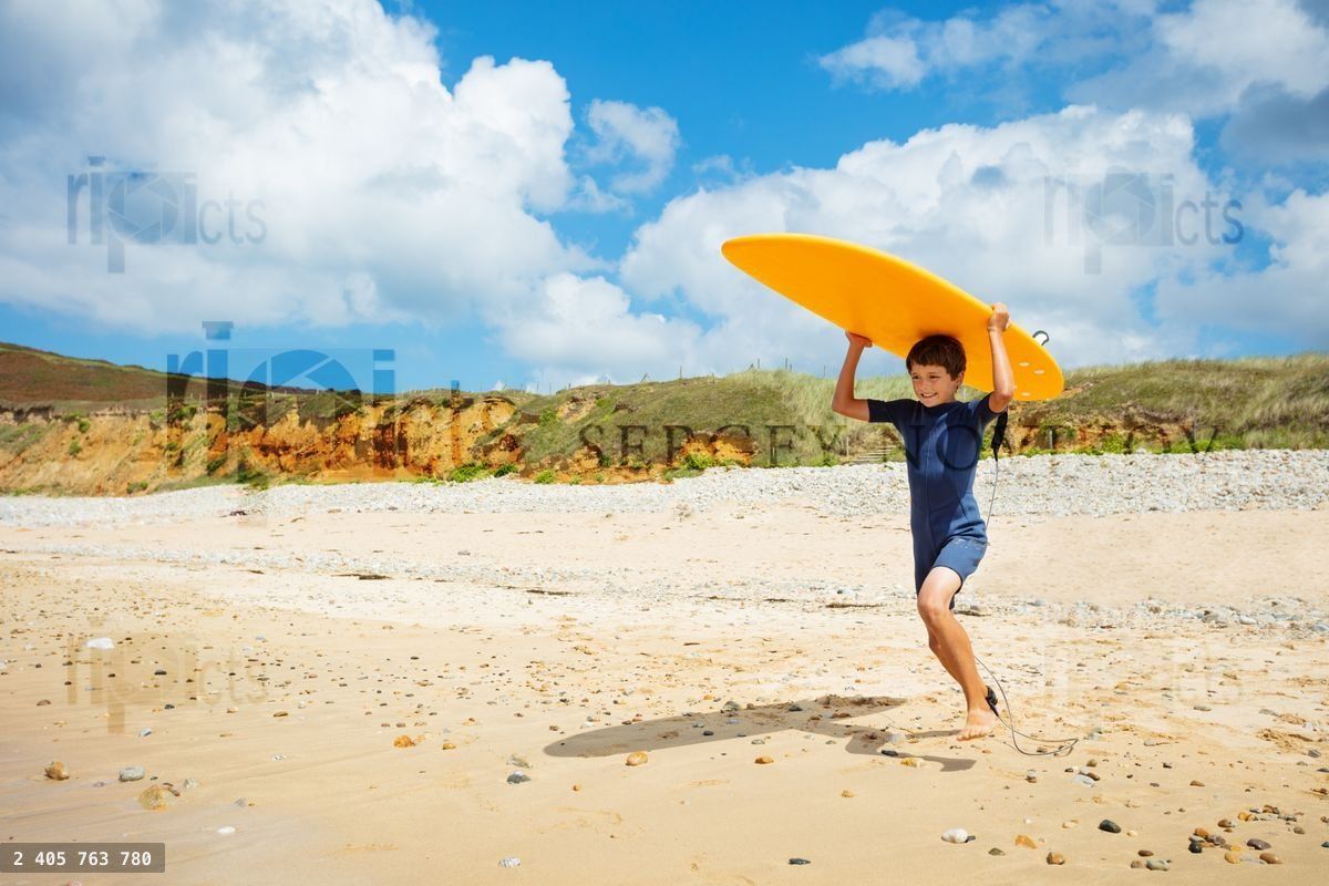 Happy little boy with surfboard run to the sea on the sand beachLoading purchase options...