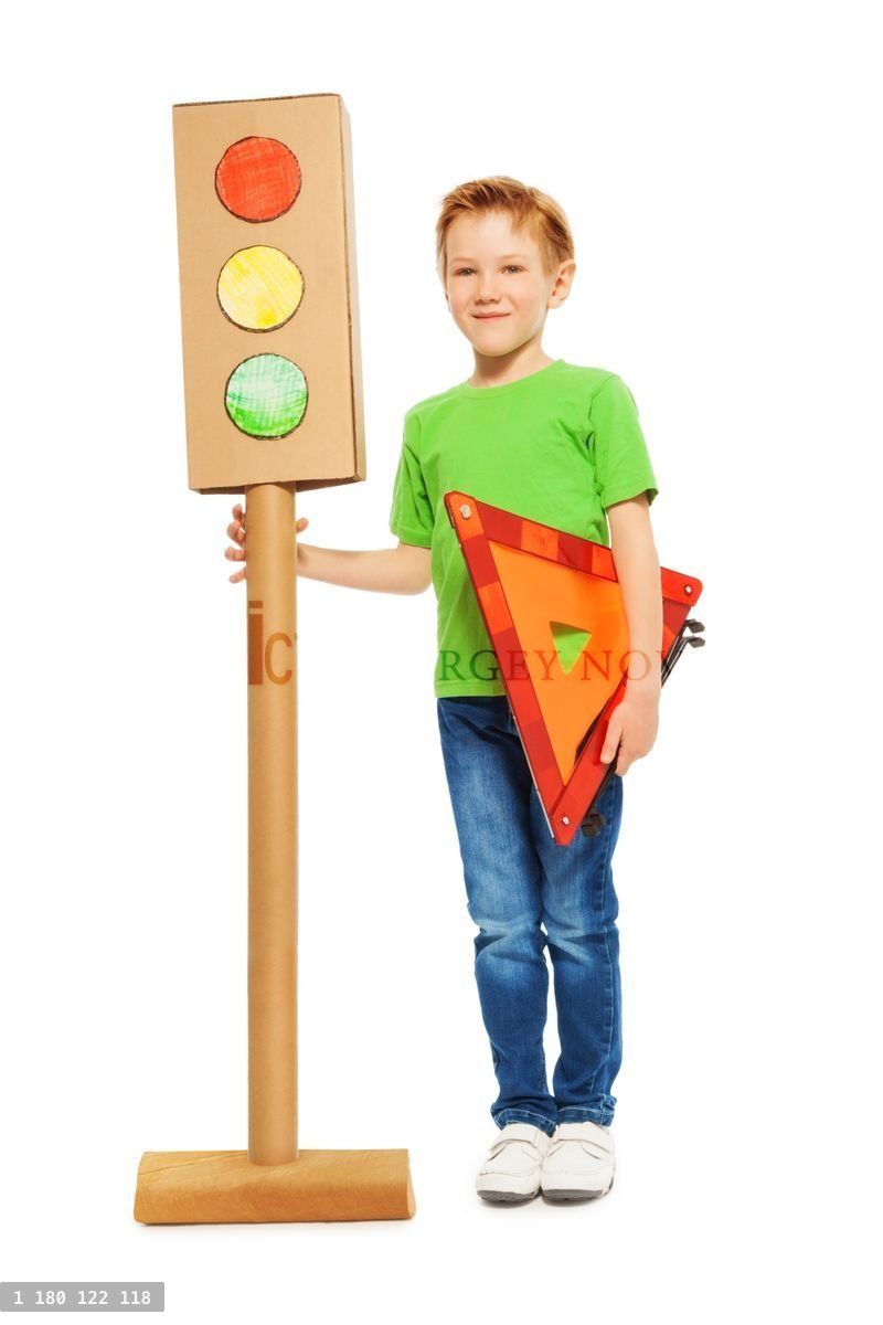 Caucasianboykidschildhoodchildrenisolatedwhitehappinesssmilehappyschoolboysevenyearspositivefunbackgroundcardboardmodelminiatureredyellowgreentrafficregulationslightlightslight-signalstopwaitgostoplightcrossroadfreewayregulationsignpedestrianrulesafetyattentionpretendgameplaywarningtrianglereflectorsignaltriangularportraitpersonroad safety class