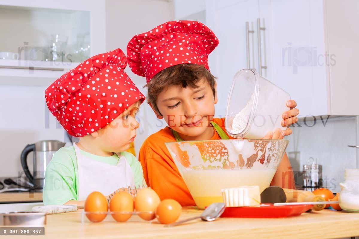 Boys add flour to the mixing bowl cooking cookies