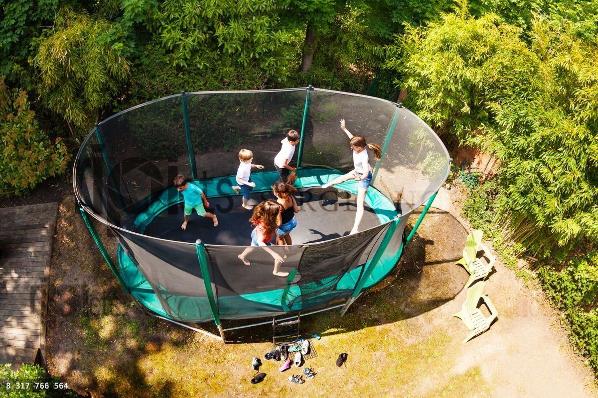 Boys and girls jumping on trampoline in the garden