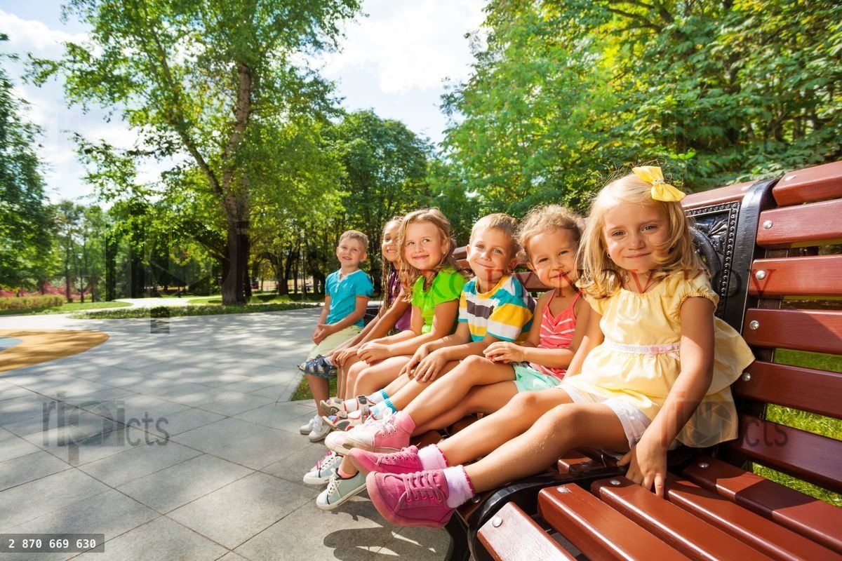 Group of little kids, boys and girls sitting together on the bench in the park on sunny day happy and smilingLoading purchase options...