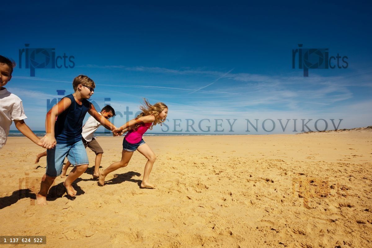 fun on the beach - group of friends, boys and girls run holding hands on the sand near seaLoading purchase options...
