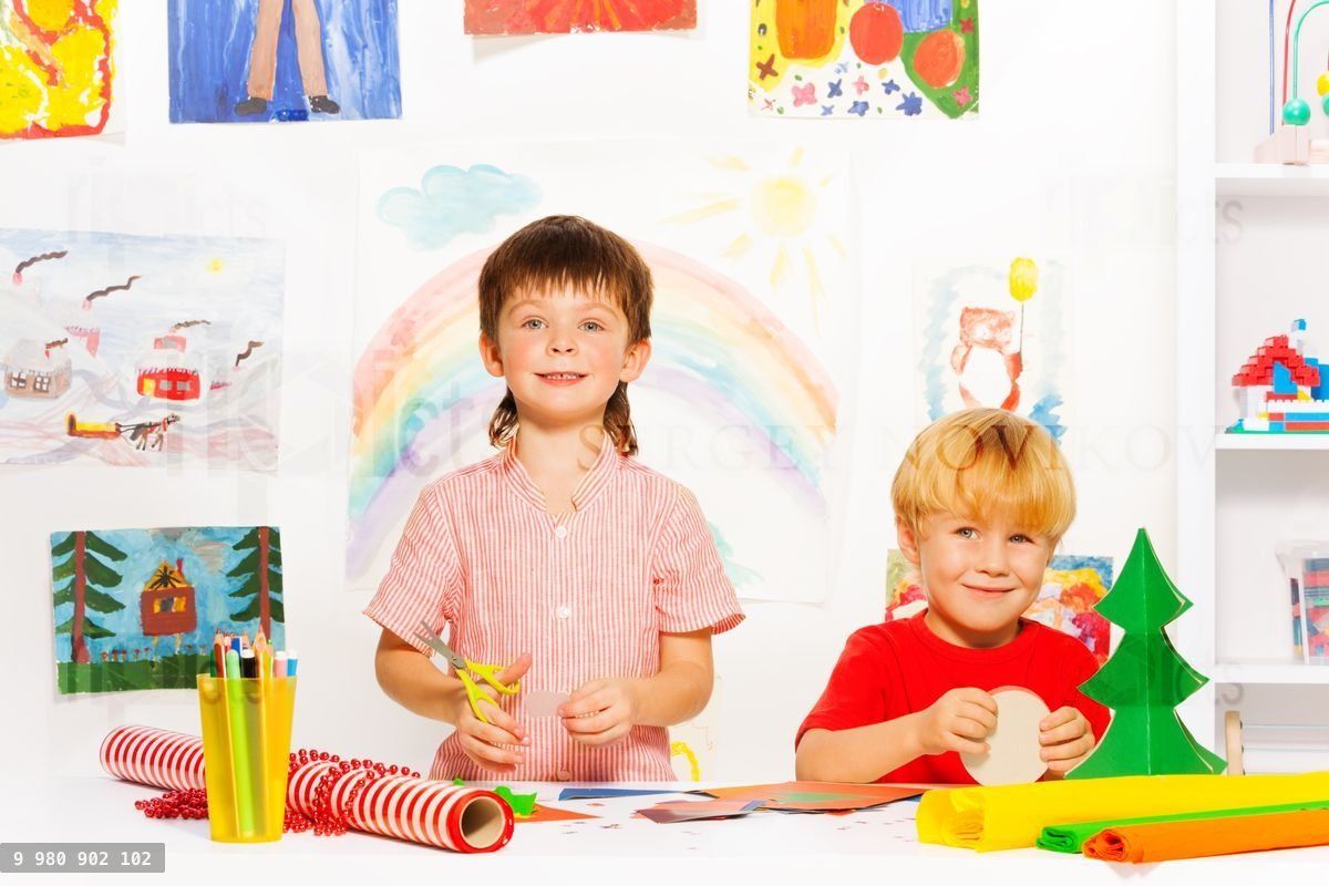 Boys cutting colorful carton at the white table with Christmas tree, pencils and paper rolls on itLoading purchase options...