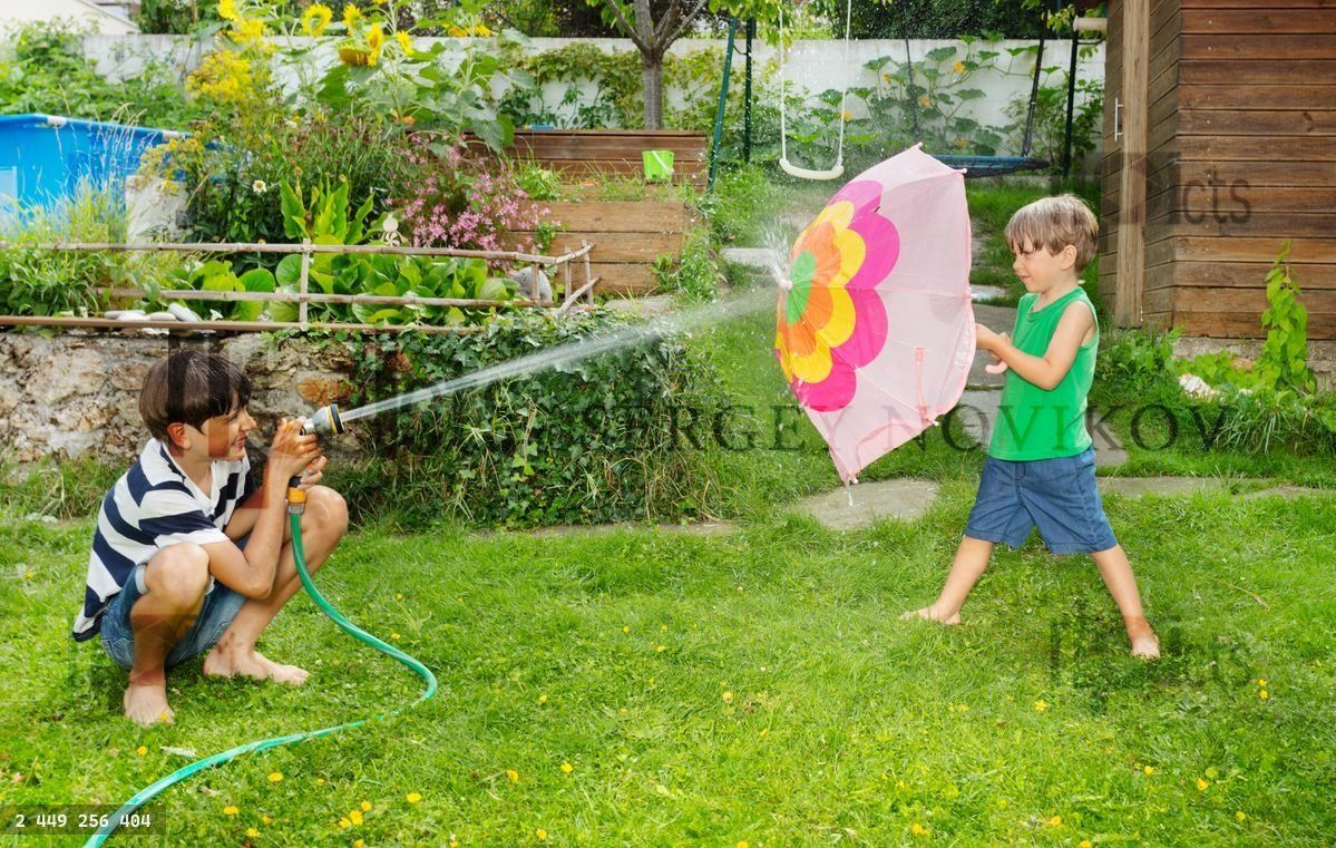 In a scene of childhood joy, one child squirts water from a hose and another kid defends with a multi-colored umbrella in a blooming gardenLoading purchase options...
