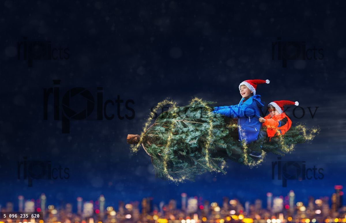 Magical image of two boys fly on the Christmas tree over city at night wearing Santa hat holding togetherLoading purchase options...