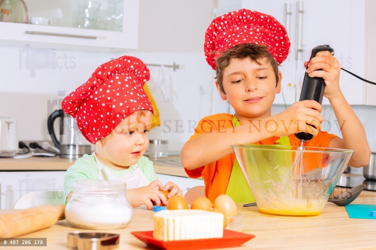 A boy mix eggs in a bowl to create dough sitting with little toddler brother at kitchenLoading purchase options...