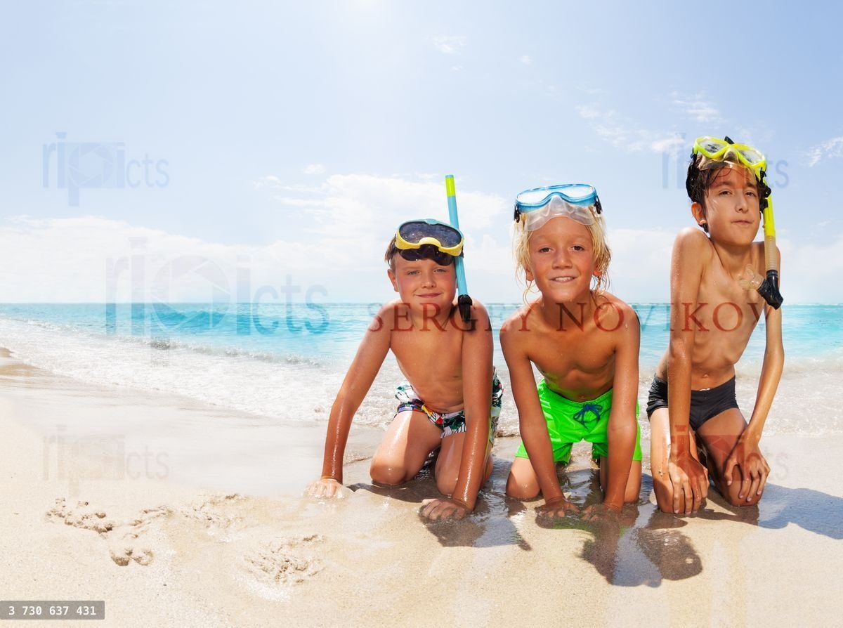 Boys on the sea beach before diving in scuba masks