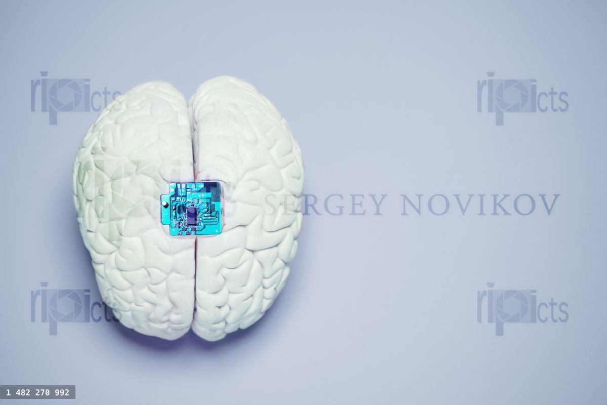 Concept of brain computer interface - human mind with electronic chip embedded inLoading purchase options...