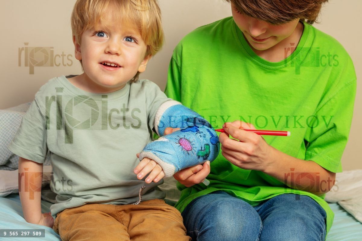 Brother boy draw with felt-tip pen on a broken hand cast to show support and improve spiritLoading purchase options...