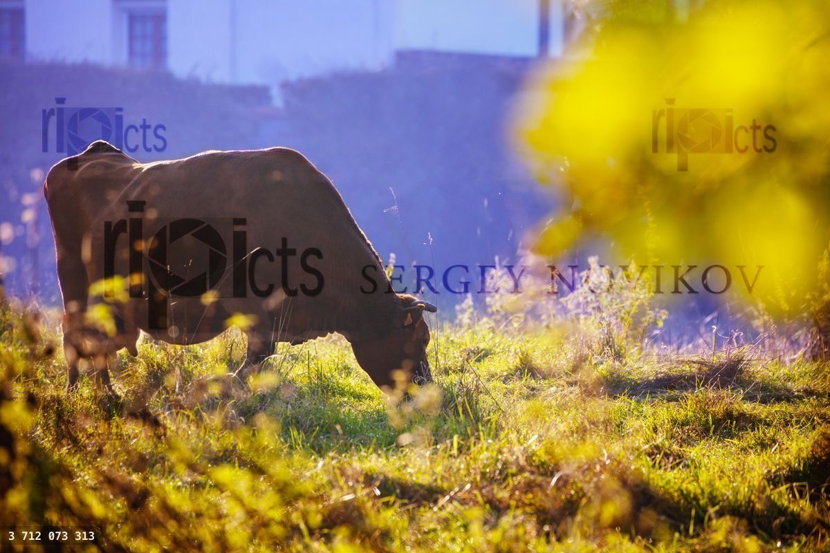 Brown cow on field eating grass during the sunset in autumnLoading purchase options...