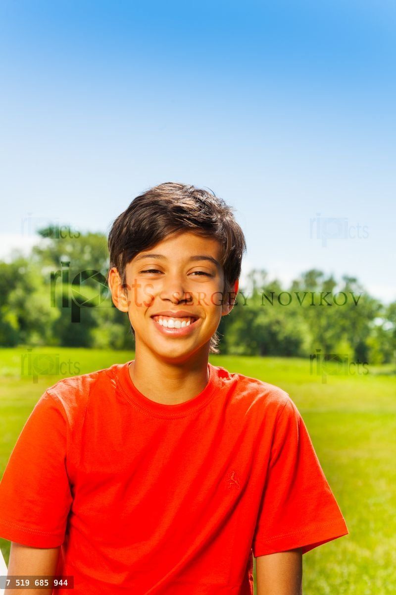 Brunet happy boy in red T-shirt portrait in summerLoading purchase options...