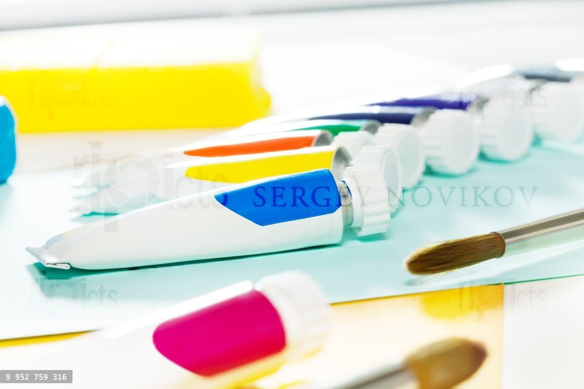 Set of blanked tubes with multicolored oil paint and brushes laying on the tableLoading purchase options...