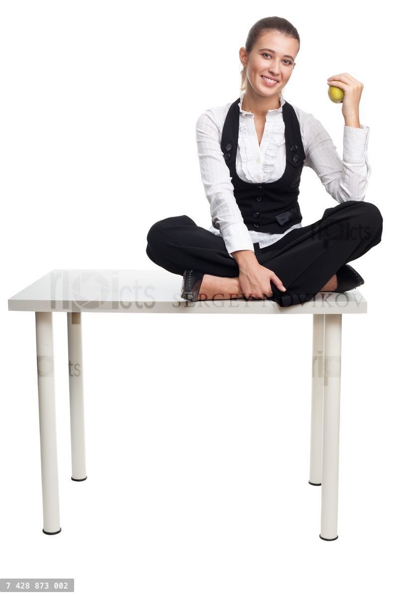 Happy business woman sit on a table and hold appleLoading purchase options...