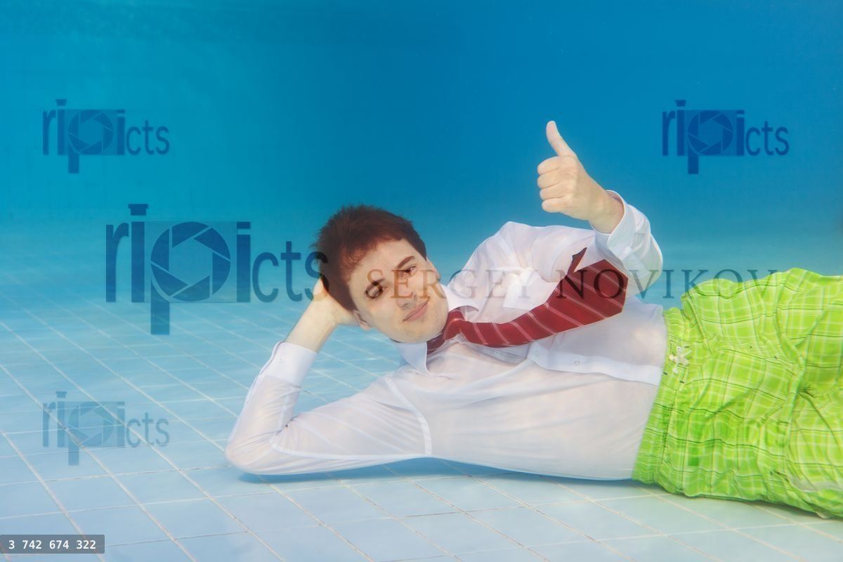 Happy businessman underwater with thumbs up resting underwater in the poolLoading purchase options...
