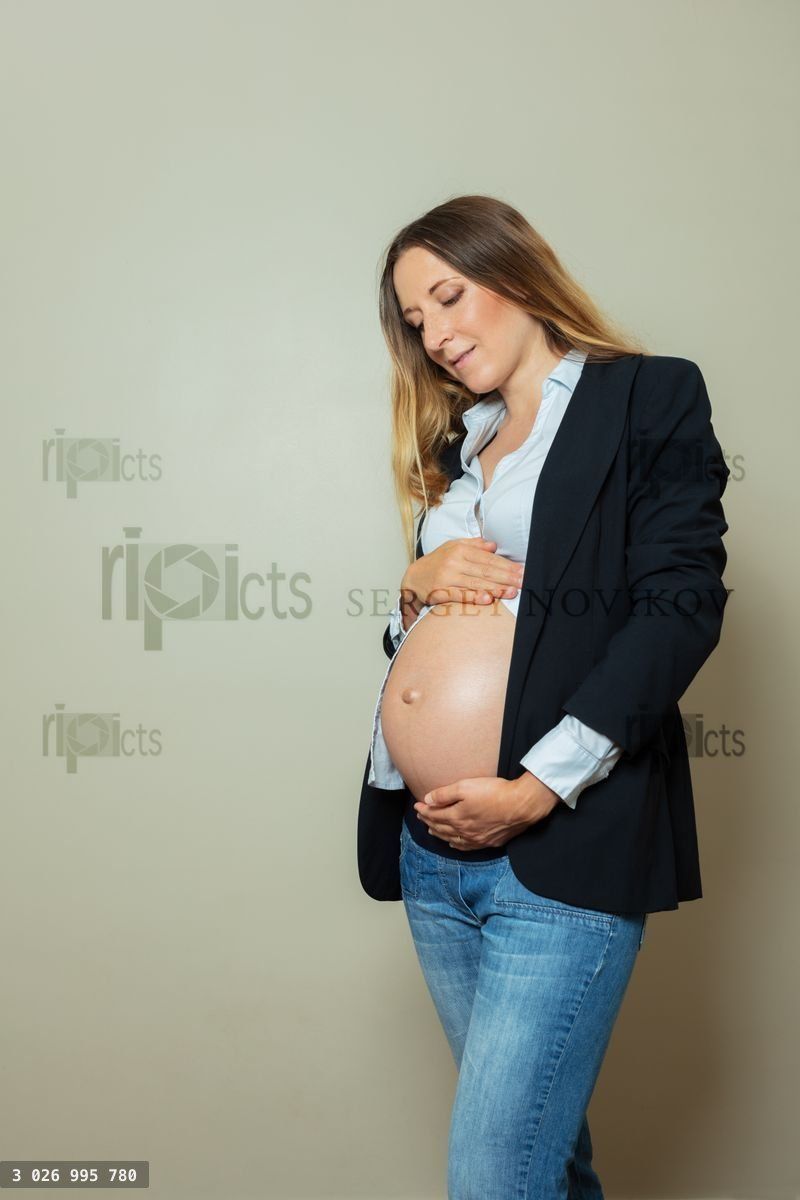 Calm pregnant woman wearing suit showing big belly working businesswoman conceptLoading purchase options...