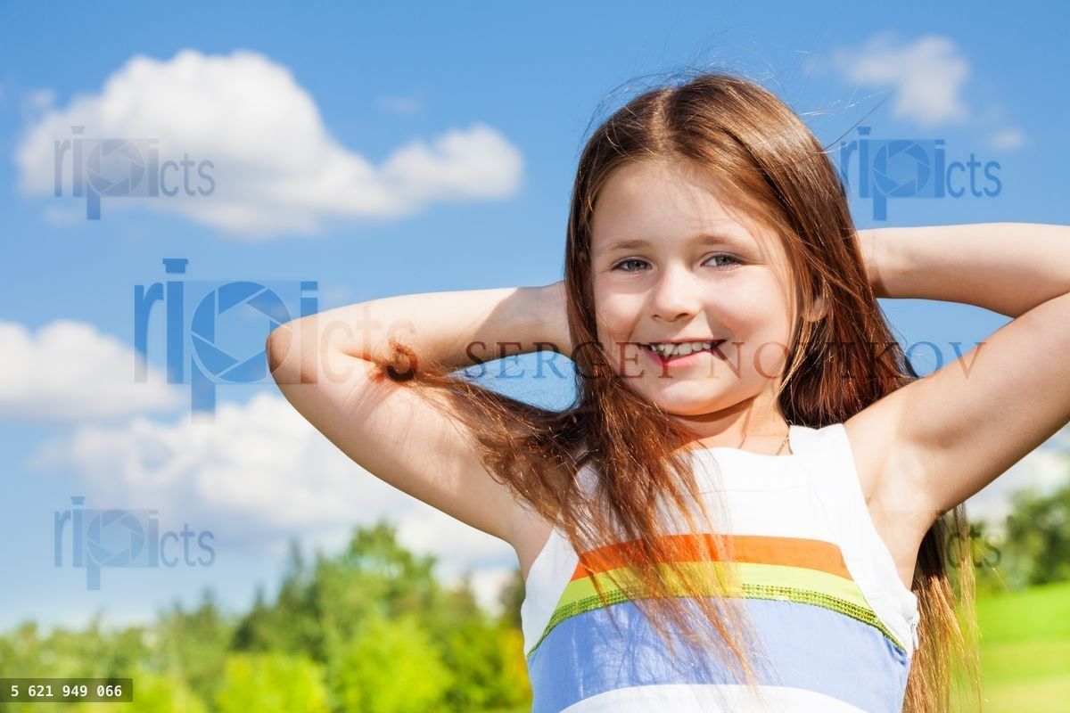 Close portrait of happy smiling little girl with long hairs standing outside on sunny dayLoading purchase options...
