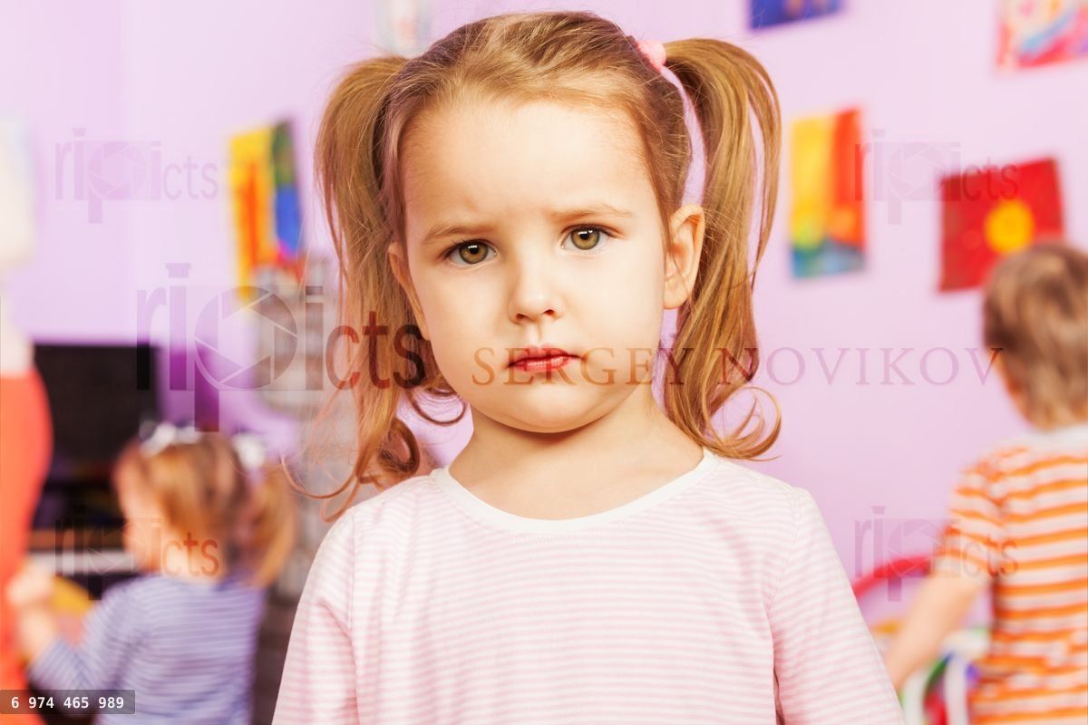 Portrait of calm little girl with kindergarten friends group on the backLoading purchase options...