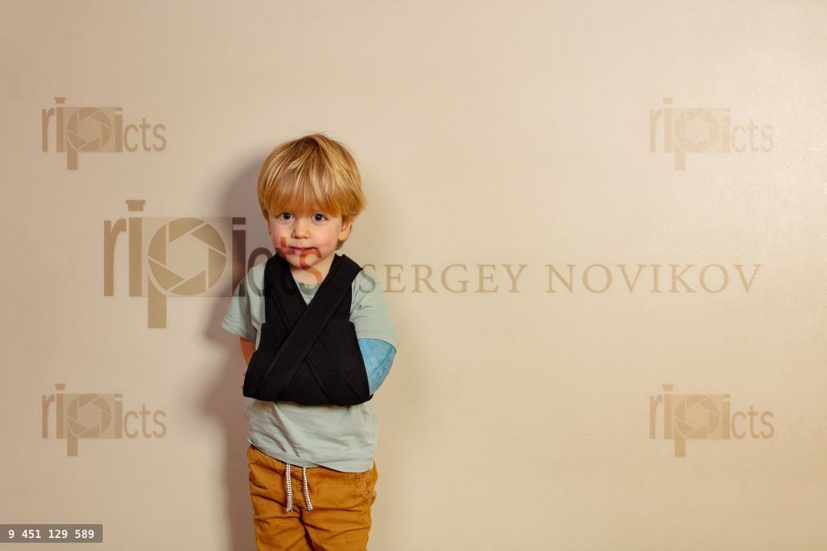 Portrait of a calm young boy with broken hand in cast after accidentLoading purchase options...