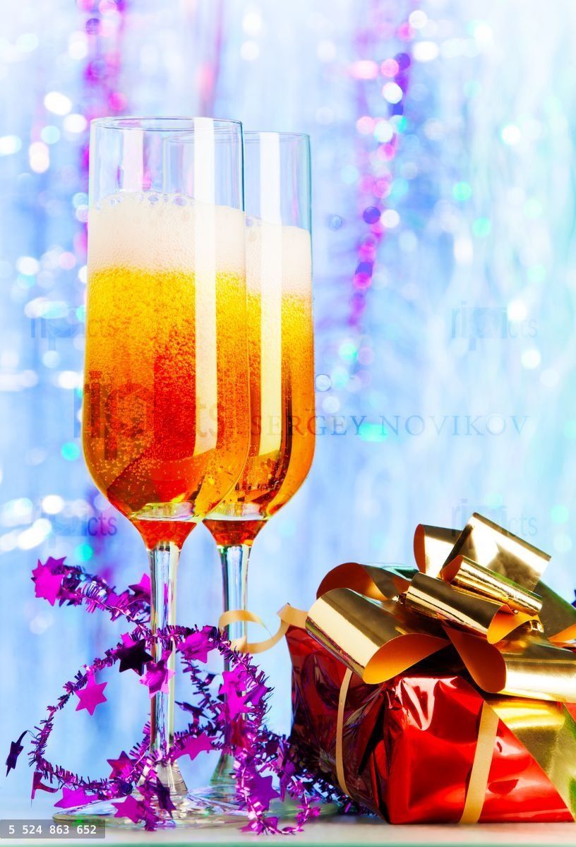Two glasses with campaign filled with alcohol with festive Christmas decoration and red small present with gold ribbonLoading purchase options...