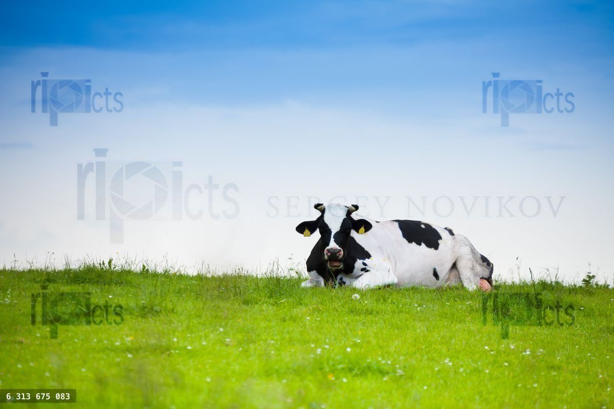 Black and white cow laying on clean sky and green grass field backgroundLoading purchase options...