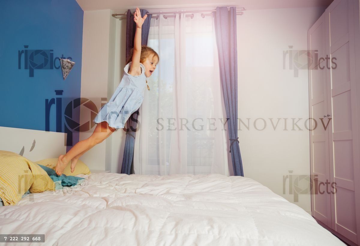 A young girl is leaping onto a bed in a brightly lit bedroom with blue curtainsLoading purchase options...