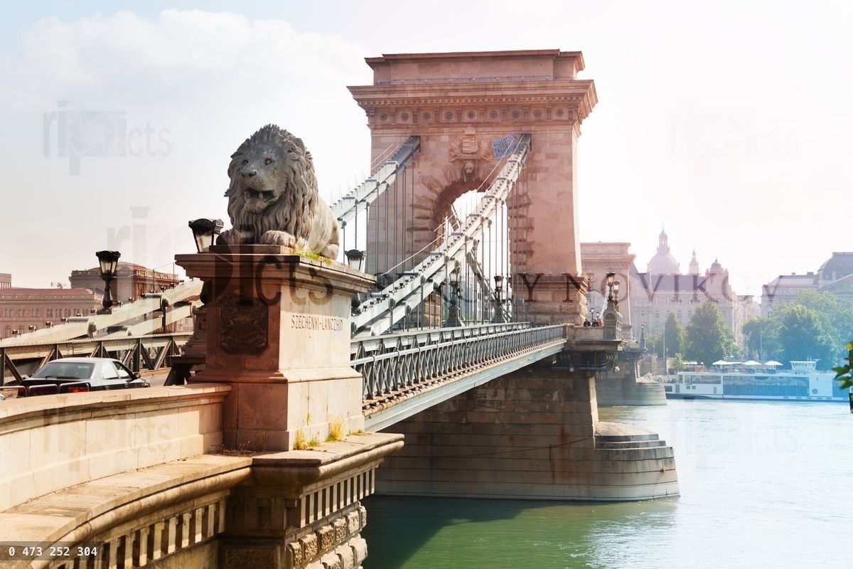 Chain bridge with monument of lion in in summer time in Budapest, HungaryLoading purchase options...
