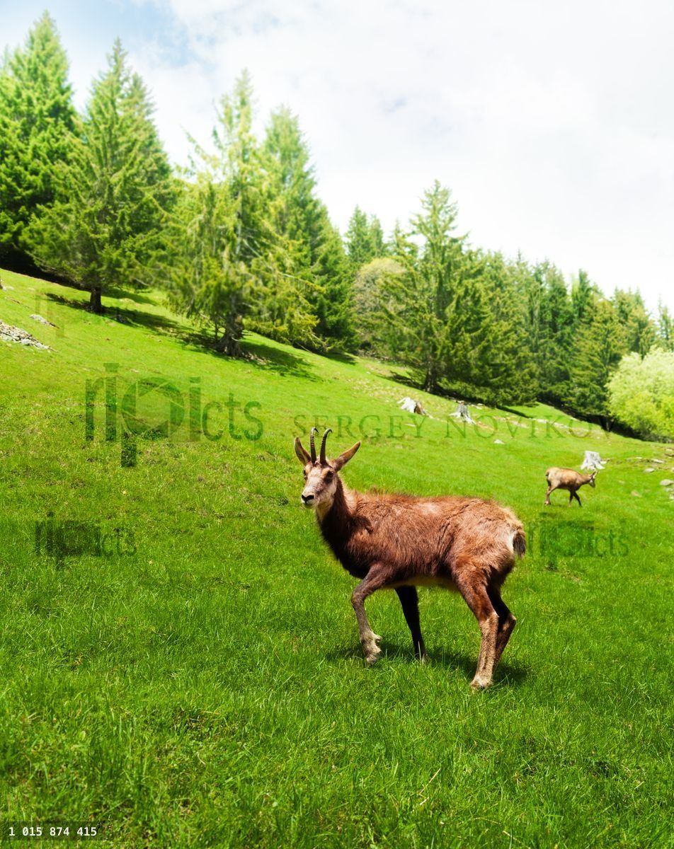 Chamois gazing on a green alpine meadow in Chamonix at the foot of Mont BlancLoading purchase options...