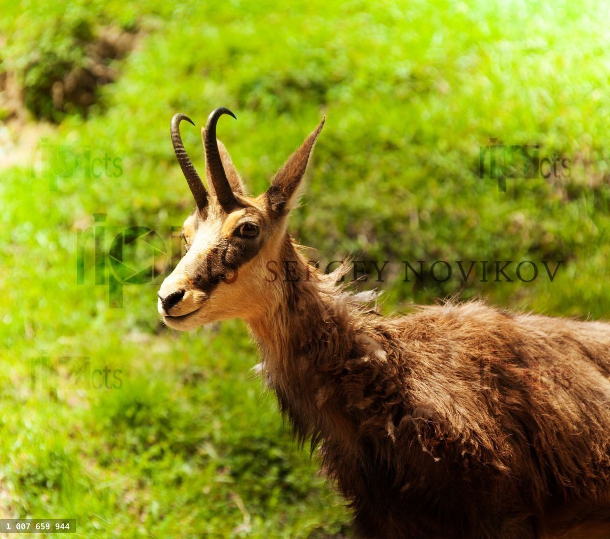 Close-up view of chamois on a green alpine meadow in ChamonixLoading purchase options...